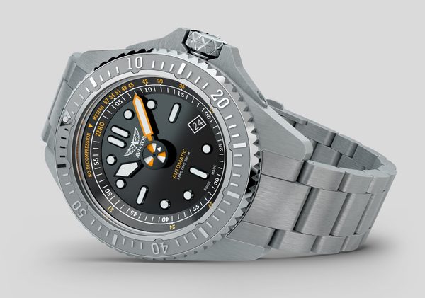 Hodinky Aviator XPRO DIVE BREATHER 300 AUTO byly navrženy pro ty, kteří se orientují v oblacích i v hlubinách vod, a nově definují profesionální měření času. Tyto hodinky, navrženy pro potápěče i piloty, kombinují leteckou přesnost s odolností v hluboké vodě. Díky vodotěsnosti do 300 metrů, kvalitnímu švýcarskému strojku s automatickým nátahem a dobře čitelnému ciferníku hodinky zajišťují špičkový výkon, ať už se vznášíte nad oblaky nebo zkoumáte hlubiny vod.