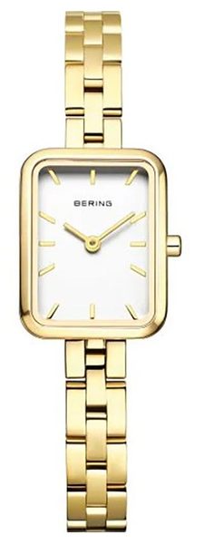 V ocelovém pouzdře hodinek o velikosti 26 x 20 mm se zlatou povrchovou úpravou je usazen bílý číselník, který slouží jako podklad pro elegantní zlaté ručky. Vše pak chrání kvalitní safírové sklíčko.