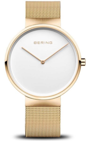 Dámské ocelové hodinky Bering Classic 14539-334 jsou elegantní a stylové hodinky, které zaujmou čistým provedením bílého ciferníku s kontrastně rámovaným zlatým pouzdrem. Hodinky drží na ruce díky pletenému milánskému náramku z ušlechtilé oceli, jehož velikost lze velmi snadno přizpůsobit i v domácích podmínkách. Pouzdro i náramek mají PVD povrchovou úpravu v barvě žlutého zlata.