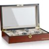 Box na hodinky Designhütte Auckland Cherry 12 70005-199 pro 12 kusů hodinek. Kazety na hodinky z řady Auckland jsou ztělesněním klasické elegance při ukládání hodinek. Harmonická kombinace teplých ebenových tónů, kontrastních černých okrajů a aplikací ve zlaté barvě dodává každé krabičce nadčasový, elegantní charakter.