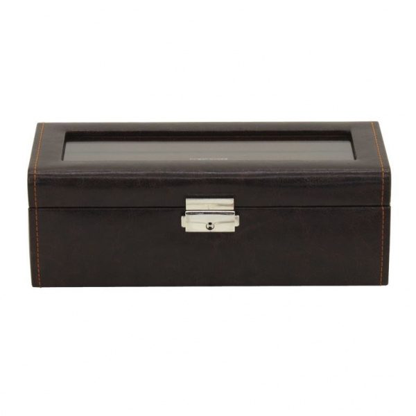 Elegantní box na hodinky Friedrich Lederwaren Bond 20086-3 s průhledným víkem pro 4 kusy hodinek. Vyrobeno z hnědého syntetického materiálu se světle hnědým semišovým interiérem.