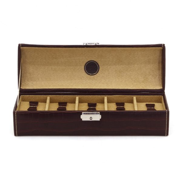 Elegantní box Friedrich Lederwaren Le Croc 20120-3 pro 5 kusů hodinek. Vyrobeno ze syntetického materiálu hnědé barvy se vzorem krokodýla. Interiér boxu je žluté barvy.