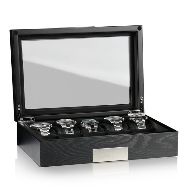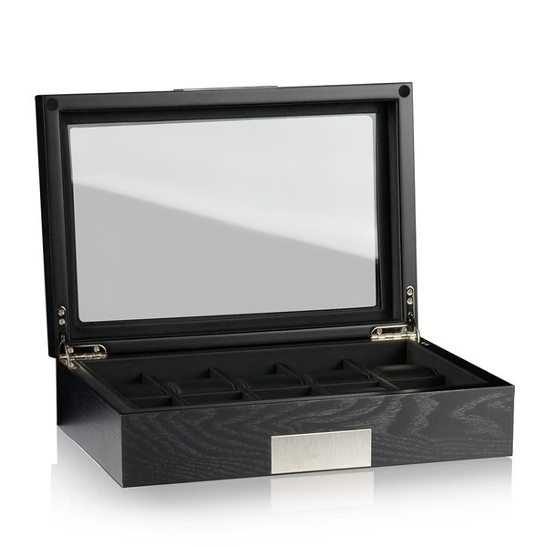 Elegantní box na hodinky Heisse & Söhne Executive Monteray 10 70019-108 na 10 kusů hodinek s proskleným víkem. Vyrobeno z dřevěné dýhy černé barvy, se semišovým interiérem a kovovými detaily na víku.