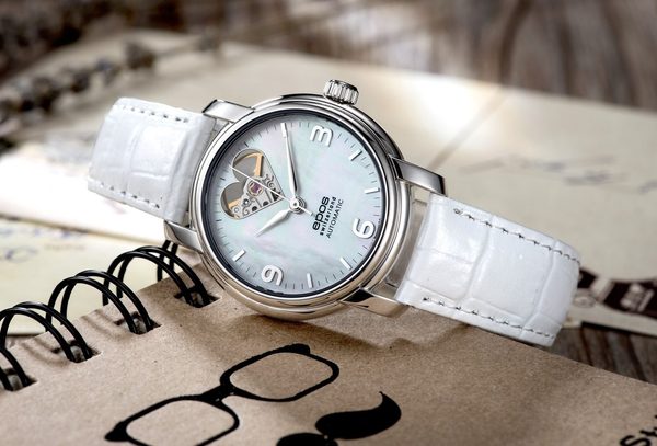 Dámské hodinky Epos Ladies 4314.133.20.50.10 jsou vyvedeny v moderním designu, o který se stará vedle perleťového číselníku také průhled na strojek ve tvaru srdce.