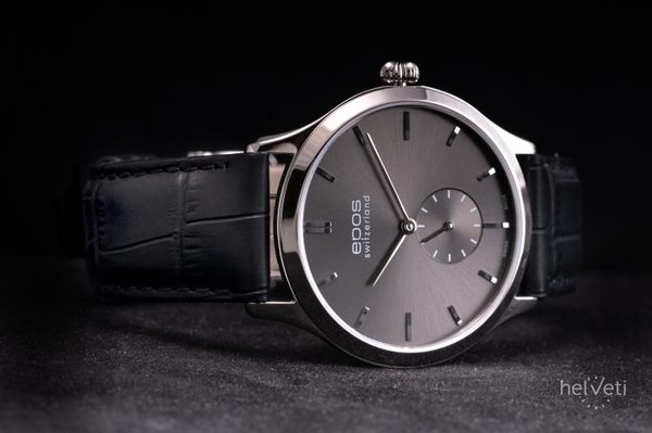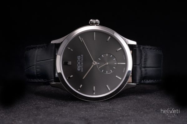Hodinky Epos Originale 3408.208.20.14.15 s nadčasovým, přehledně zpracovaným číselníkem, kterému dominuje mimostředná vteřinová ručička, umístěná na 6. hodině.