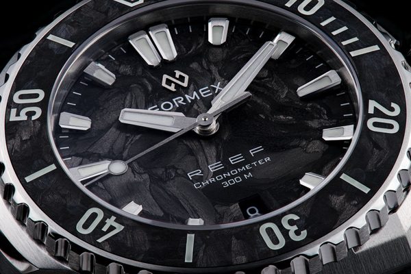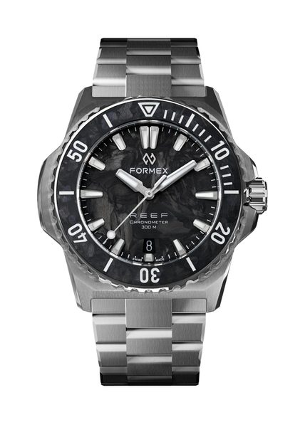 Švýcarské potápěčské hodinky Formex Reef 39,5 Automatic Chronometer Forged Carbon 2201.1.6399.100 zaujmou na první pohled lunetou a unikátním číselníkem z kovaného karbonu, který dává každému kusu zcela originální vzhled. Charakteristické pouzdro s čistými liniemi pak podtrhuje moderní, všestranný a technicky vyspělý charakter celé kolekce Reef.