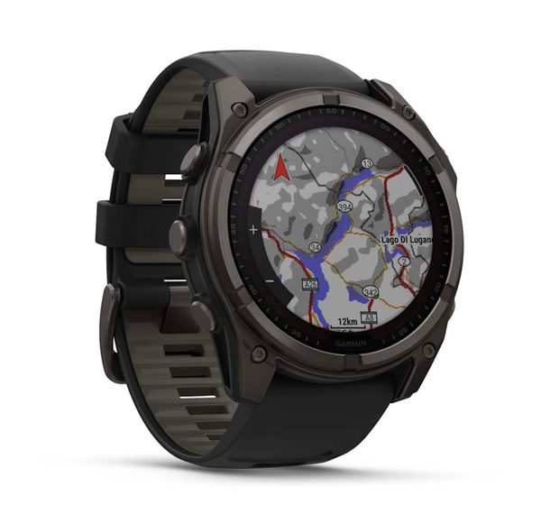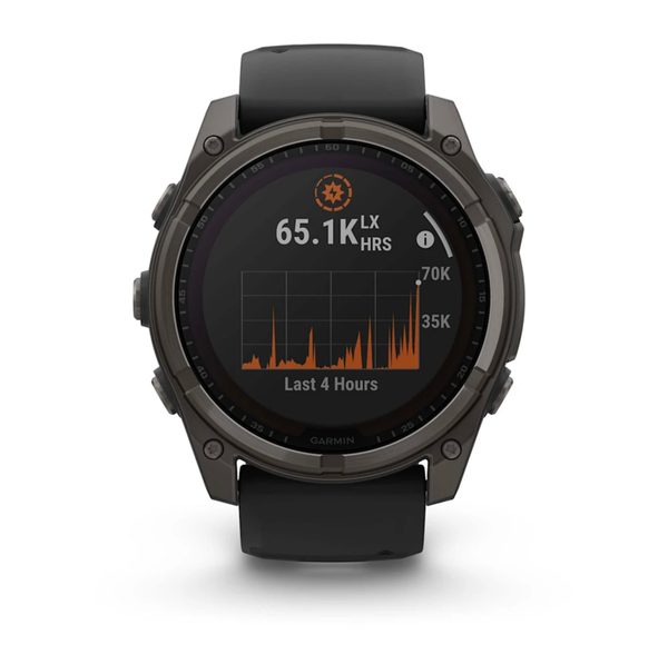 Fenix® 8 – 51 mm, Solar, Sapphire Sapphire, Carbon grey DLC titanium s Black/Grey silikonovým řemínkem jsou prémiové, chytré GPS hodinky s vysokou odolností a dlouhou výdrží. Elegantní vzhled, všestrané sportovně-outdoorové využití. Pokročilé tréninkové funkce, vestavěný mikrofon a reproduktor, integrovaná LED svítilna a nově i potápěčské funkce.