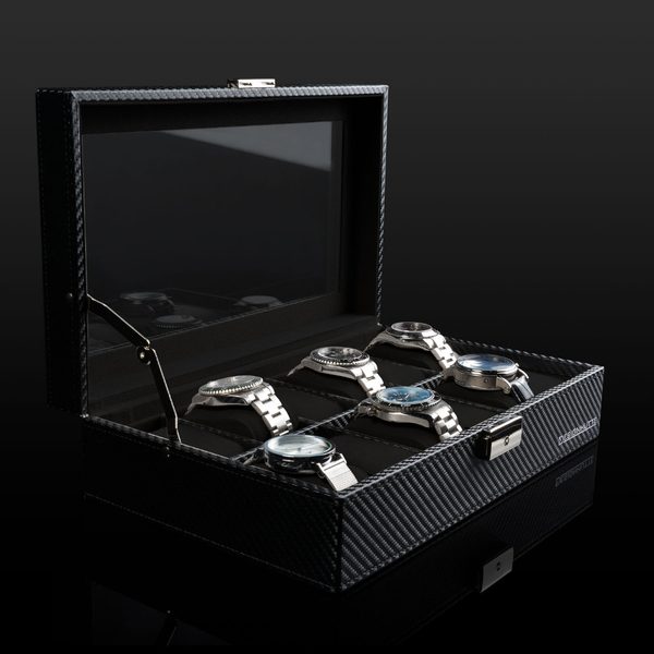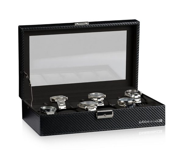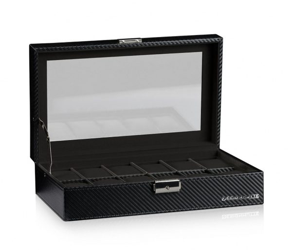 Elegantní box na hodinky Designhütte Boston 12 70005-185 pro 12 kusů hodinek s proskleným víkem. Vyrobeno ze syntetické kůže černé barvy s karbonovým vzorem. Kazeta je uzamykatelná.