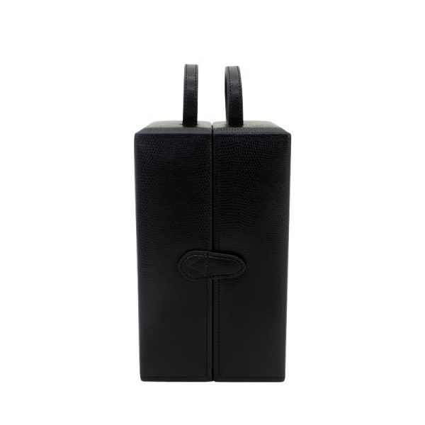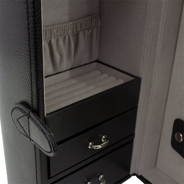 Šperkovnice Friedrich Lederwaren Milano 20141-2 černé barvy je potažena syntetickou kůží se vzorem ještěrky. Obsahuje 3 patra pro uložení různých typů šperků, zrcátko je na pravé straně šperkovnice.