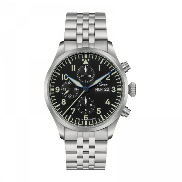 Německé hodinky Laco Chronographs Kiel.2.MB Schwarz na první pohled zaujmou typickým pilotním designem, který se vyznačuje čistotou a skvělou přehledností, díky čemuž se nejen u hodinkových fanoušků těší velké oblibě.