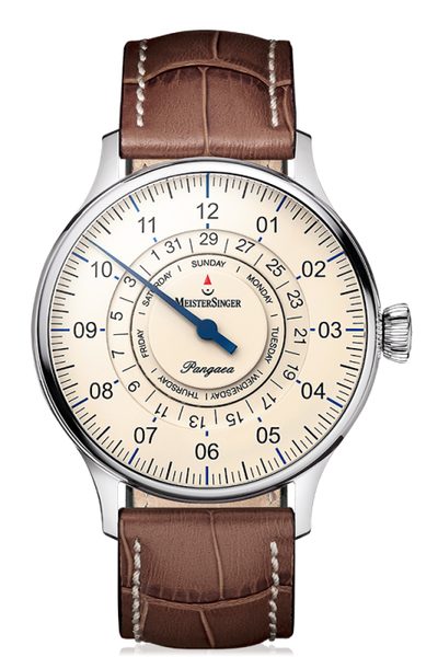 Hodinky  MeisterSinger Pangaea Day Date PDD903 spadají do řady Classic Plus a nabízí netradiční, ale o to zajímavější zobrazení času pomocí jedné jediné ručky. Hlavním znakem tohoto modelu je ukazatel dne a data, zobrazený pomocí disků ve středu číselníku. Příznivci kvalitní hodinařiny a netradičních řešení si tedy rozhodně přijdou na své.