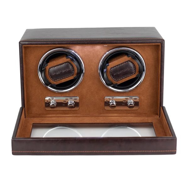 Natahovač Friedrich Lederwaren Bond 29482-3 hnědé barvy, pro 2 kusy mechanických hodinek s automatickým nátahem, který zaujme svým klasickým designem. Vyrobeno ze syntetického materiálu, interiér je vyveden v hnědé barvě s vnitřním LED osvětlením. Díky různým režimům otáčení je vhodný téměř pro všechny běžné hodinky s automatickým nátahem. Průhled na hodinky je z plexiskla. Adaptér je součástí balení.