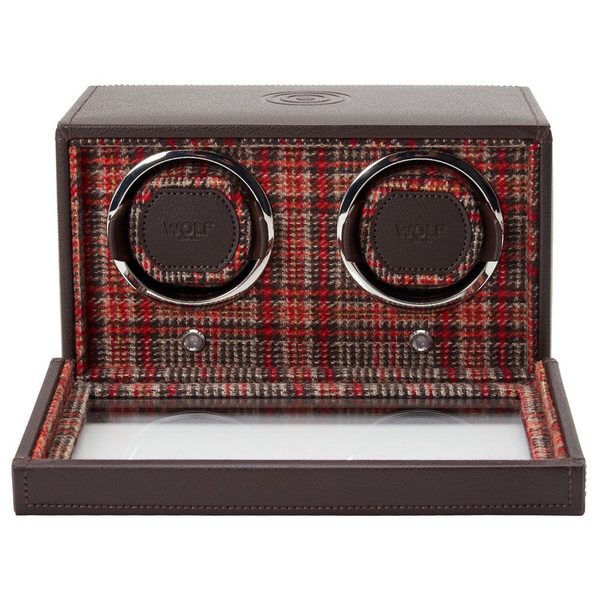 Natahovač Wolf Wolf x WM Brown 800700 hnědé barvy, pro 2 kusy mechanických hodinek s automatickým nátahem. Natahovač byl navržen tak, aby se do něj vešly i větší hodinky (pouzdro až 52 mm). Exteriér je potažen veganskou kůží, interiér je z tvídové látky Negroni.