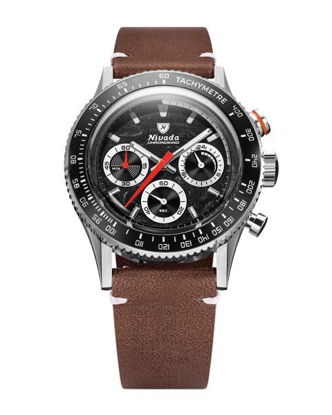 Nivada Grenchen Chronoking Mecaquartz Racing Black – Inter. Bezel – Brown Leather White Stitching