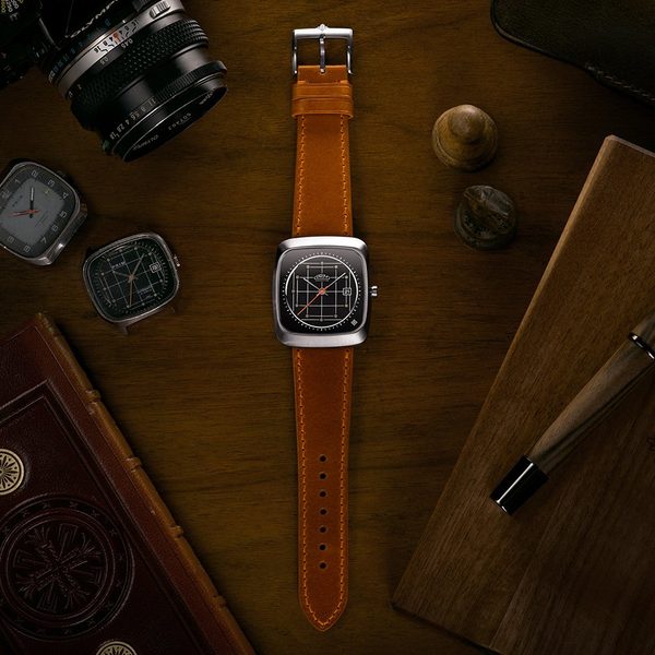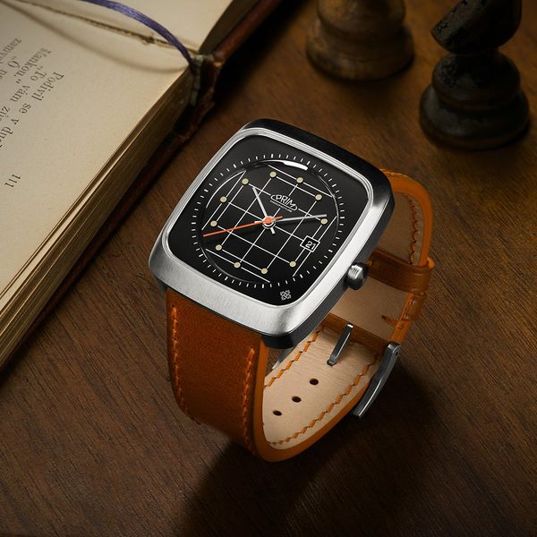 Černý číselník vytváří harmonický kontrast s výraznou oranžovou vteřinovou ručkou, která ladí s jemným prošitím na kvalitním koženém řemínku. Tento detail dodává hodinkám retroaktivní charakter a…