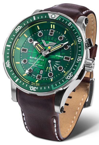 Pánské hodinky Vostok Europe Batiscafos Hybrid PX84-511A770 představují úplně novou modelovou řadu pojmenovanou Batiscafos. Název „Batiscafos“ pochází z řeckého ‚bathys‘ (hlubina) a „skaphos“ (loď). Plavidla jako legendární loď Trieste, která se v roce 1960 potopila na dno Mariánského příkopu (10 984 ± 25 metrů), symbolizují odhodlání prozkoumávat neznámé.