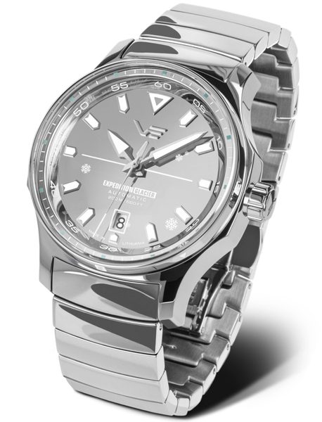 Hodinky Vostok Europe Expedition Glacier NH35-592A784 působí, jako by byly vytesány z čistého polárního ledu a vyleštěny samotným větrem. Každý jejich povrch je dokonale zrcadlově leštěný – pouzdro, náramek, ciferník i ručičky září křišťálově chladným odleskem. Výsledkem je úchvatný časoměr, který zachycuje světlo stejně působivě jako ledovec při východu slunce a okamžitě vynikne na každém zápěstí.
